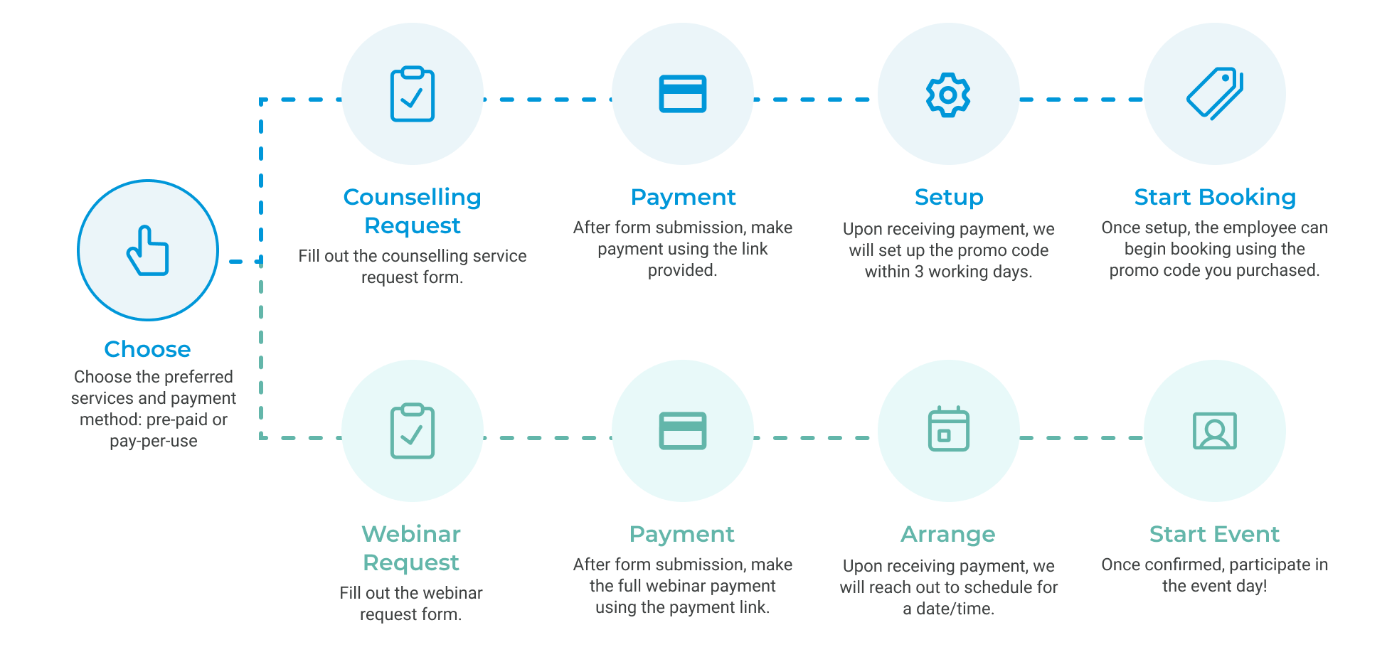 Looking for an affordable EAP package that provides mental wellbeing options for your employees? From as low as S$550, you can start with Safe Space™ Self-service (pay per use) package and customise to your need as it grows. Package includes counselling and webinars/workshops options.